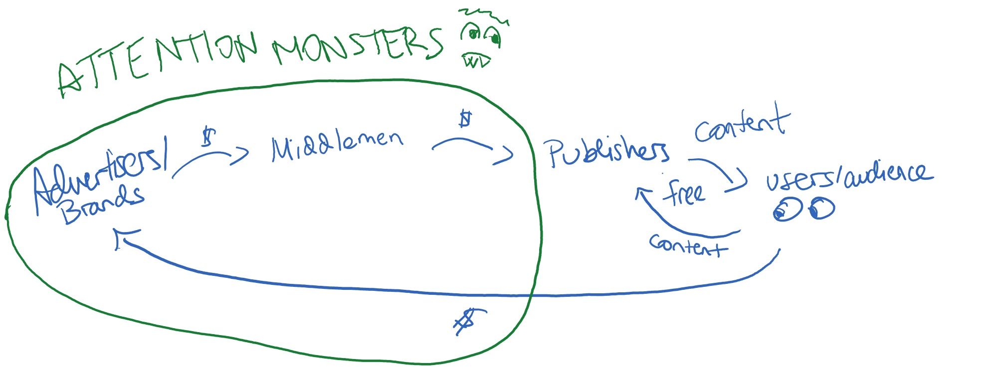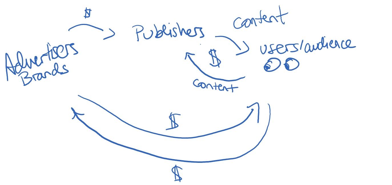 Fast-forward to Web 2.0 and these first principles are being revisited. First and foremost, content-creation badly needs a new business model. The current business model is centered around digital advertising and consists of four key players: advertisers, middlemen (DSPs, trading desks, exchanges, SSPs), publishers, and users. The advertisers and the middlemen are the attention monsters: two entities that largely bring very little positive purpose to the internet and mostly contribute to our anxiety. Advertisers, backed by major consumer brands, feed the middlemen and the middlemen broker them to publishers. Publishers — consisting of both apps and traditional media outlets — generate content in order to attract users or an audience. In the context of tech, users reciprocate by contributing their own content to publishers. Occasionally, enough impressions allows for dollars to flow back to the advertiser in the form of a purchase.